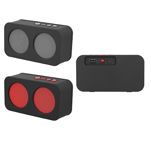 Bocina portátil de acabado rubber con Bluetooth, entrada SD, USB, radio FM y botones de color en contraste. Batería recargable con duración de 2-3 hrs.. Medida producto alto: 6 . Medida producto ancho: 12 . Area impresion: 3 x 2 cm