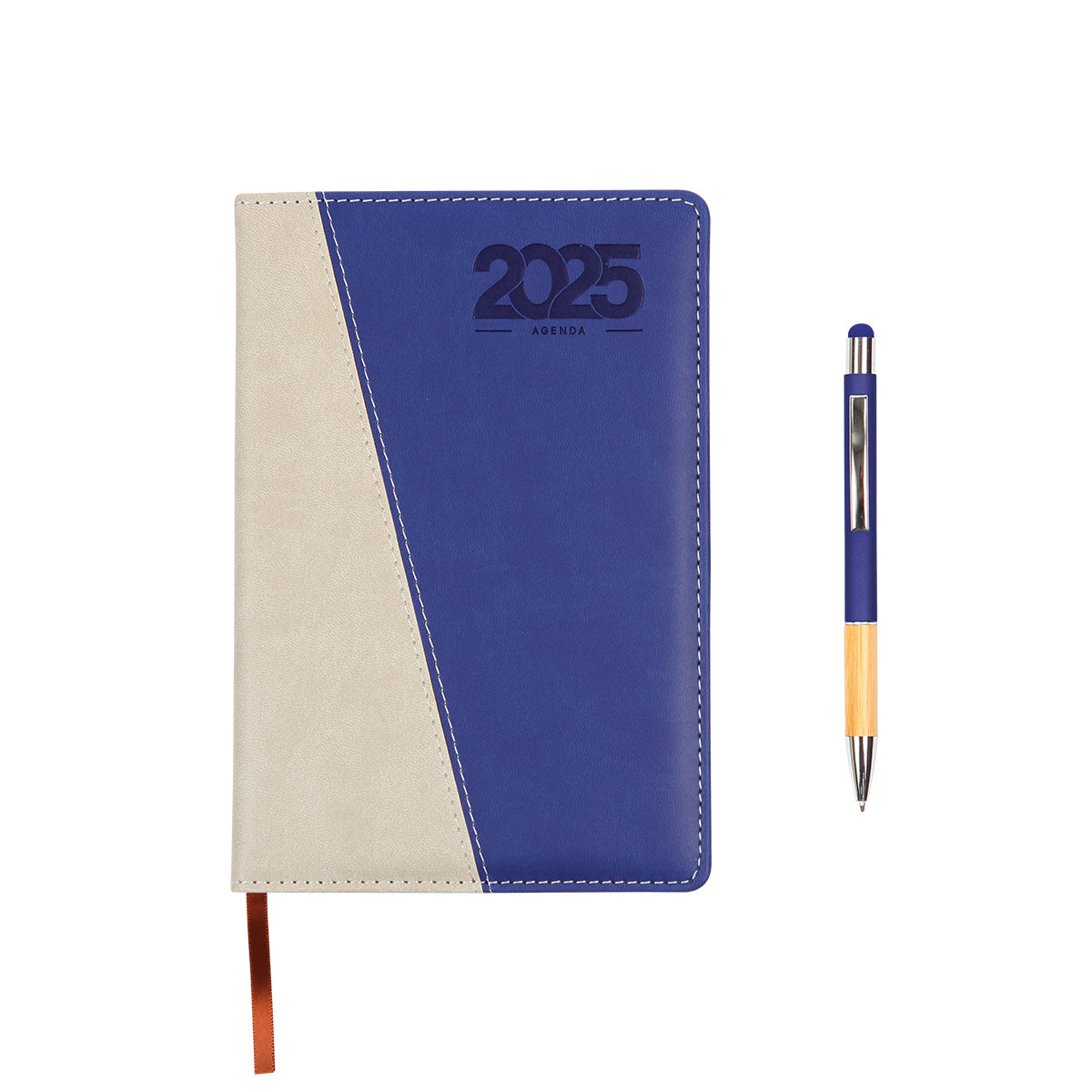Set de Agenda diaria 2026 bi-tono con pluma y caja de regalo. Cubierta bi-tono fabricada en curpiel PU e interior de 175 hojas de 65 g. 350 paginas Cada día tiene espacio para tareas importantes y está organizada por horario 5:00 am 22:00 pm. Cuenta con: Separador de hojas, calendario anual 2025-2027, planeador mensual, hoja de objetivos anuales, hoja de pendientes mensuales, espacio para notas, tareas, sección de contactos y bolsillo interno para almacenar documentos. Bolígrafo con detalle de bambú en la parte inferior, clip y punta metálicos y con touch en la parte superior. Incluye caja de cartón individual y bolígrafo con tinta de escritura negra.