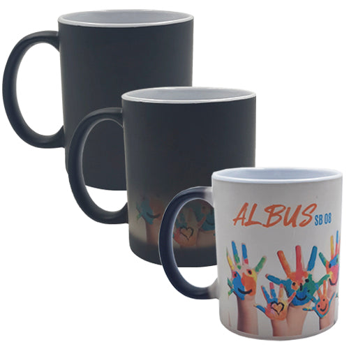 Taza mágica de cerámica para sublimación con acabado mate que al entrar en contacto con agua caliente cambia de color.. Medida producto alto: 9.5 . Medida producto ancho: 8 . Area impresion: 21 x 9 cm