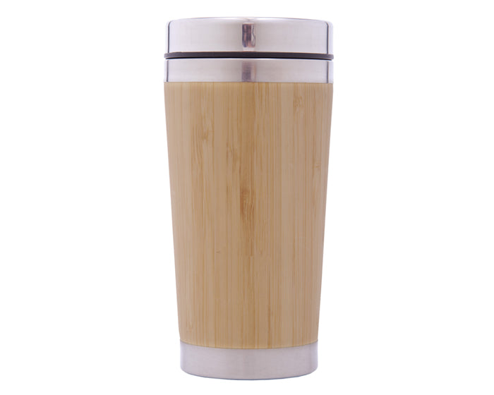 Termo de doble pared de acero inoxidable con exterior de bambú. Tapa de presión con seguro deslizable. CAP. 450 ml. Presentación: Caja en color blanco.