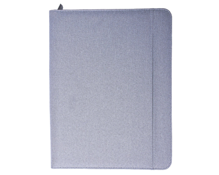 Carpeta multiusos con exterior en tela, cierre y compartimento externo para guardar tablet o documentos. Cuenta con block de notas tamaño carta de 20 hojas rayadas, compartimento interior para tablet, 2 soportes ajustables para sujetar tablets y celulares, cinta elástica para Smartphone, cinta elástica para memorias USB u otros accesorios, compartimento con ventana plástica para credenciales, divisiones para tarjetas, bolsa de malla, así como cinta elástica para fijar bolígrafo, el cual no viene incluido.
