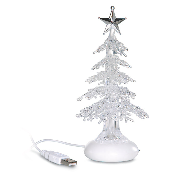 Árbol tipo lámpara LED con conexión USB y cambio intermitente de luces multicolor: rojo, azul y verde.