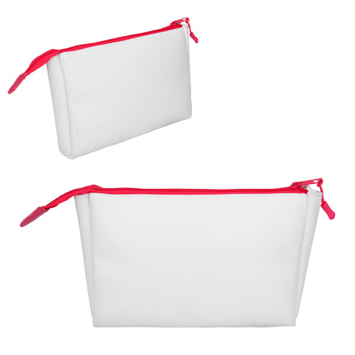 Cosmetiquera con forro, cierre de color y fuelle.. Medida producto alto: 14 . Medida producto ancho: 21.5 . Area impresion: 13 x 10 cm