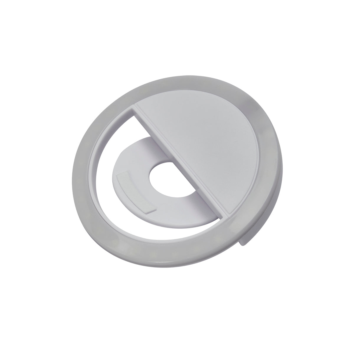 Aro de luz de 28 LEDs con clip ajustable. Se puede montar en smartphones o computadoras para mejorar las fotografías, videos o videollamadas. Cuenta con 3 diferentes intensidades de luz. Incluye batería recargable y cable auxiliar micro USB.. Medidas: 8.5 cm Diámetro . Material: Plástico