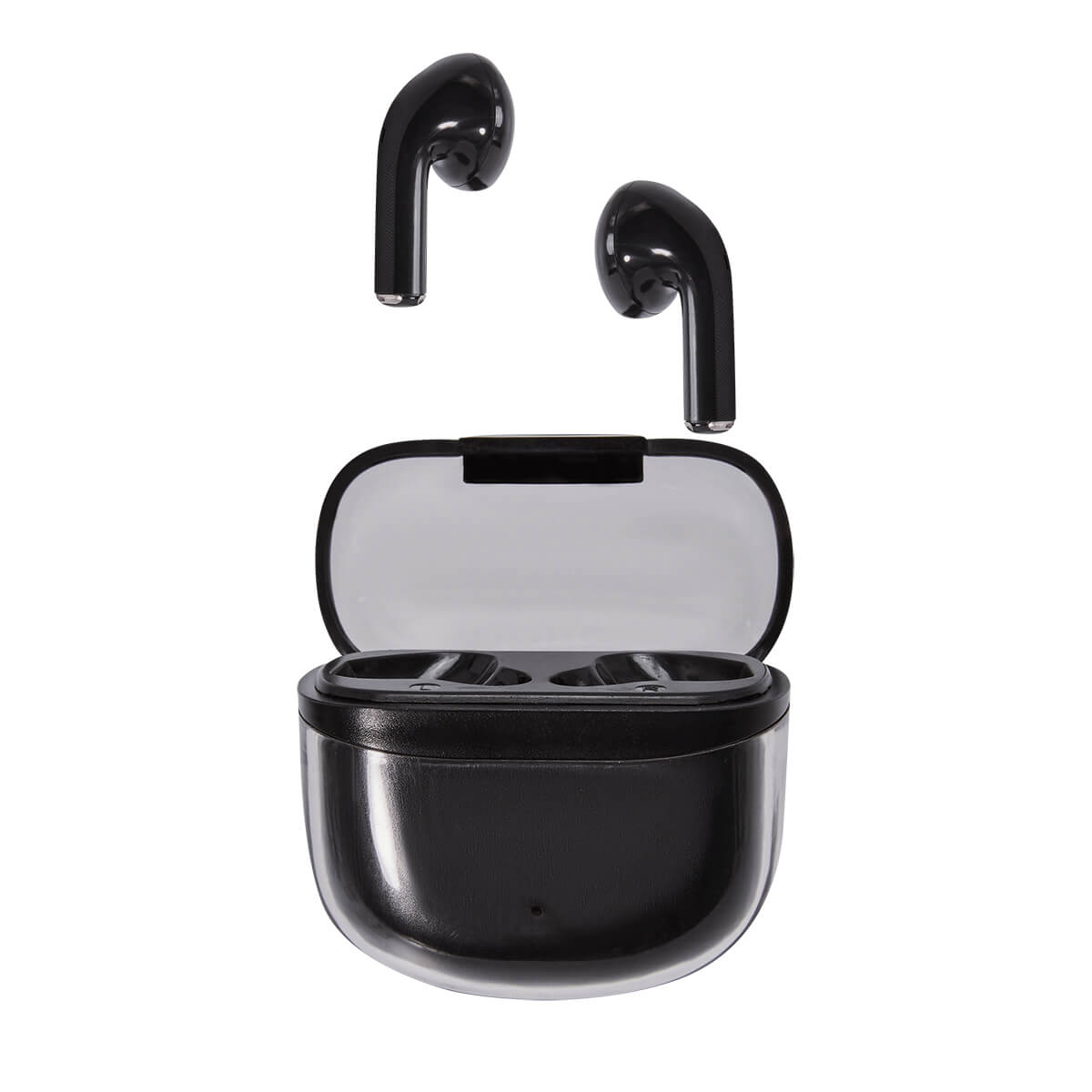 Audífonos bluetooth con base recargable. Controles integrados touch para llamadas, volumen y reproducción de audio. Reproducción de música 2 a 3 hrs aproximadamente. Rango de conexión de 10 metros. Incluye estuche de carga y cable cargador USB.. Medidas: 4.7 x 4.9 cm . Material: Plástico
