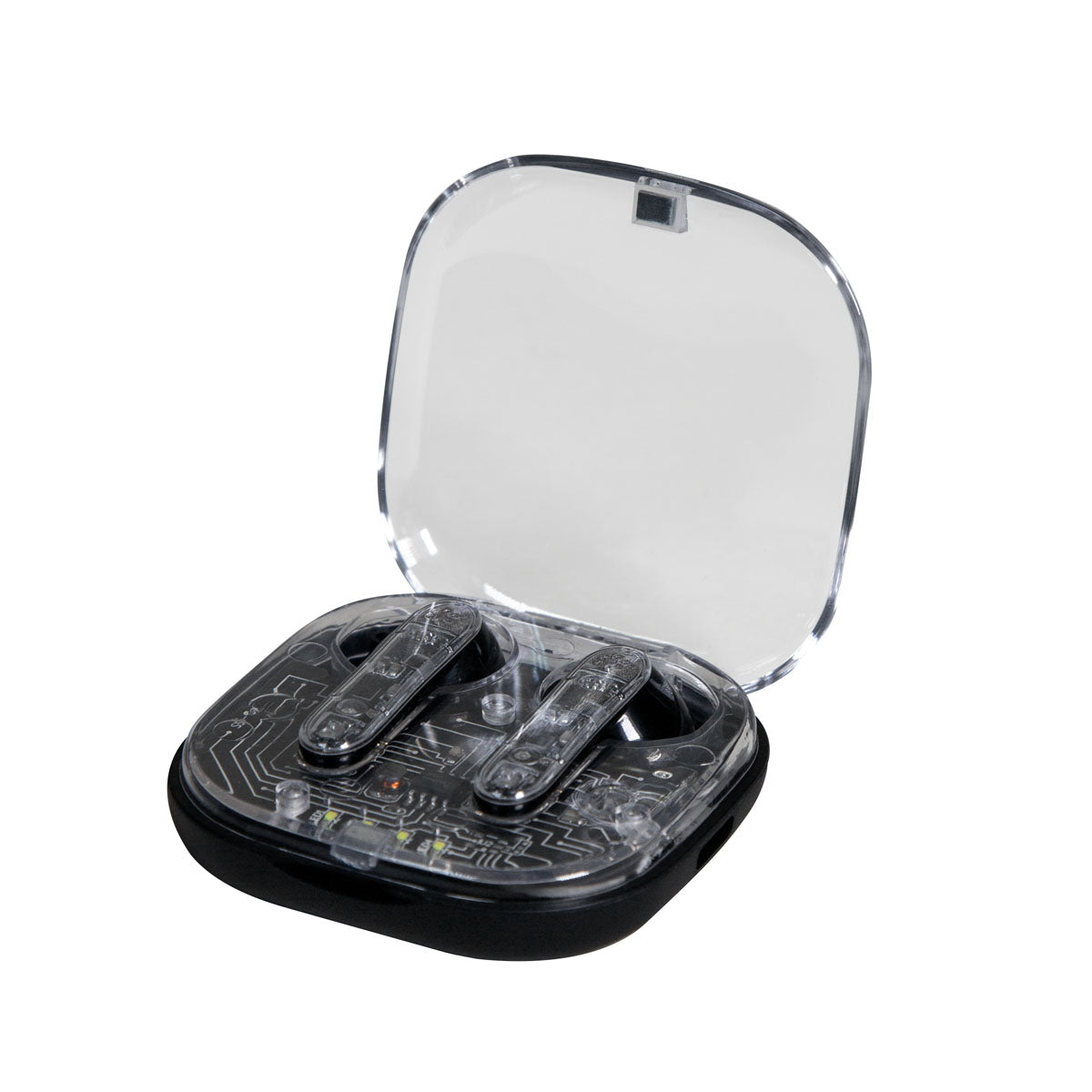 Audífonos bluetooth con base recargable. Su diseño permite una visión a su circuito interno gracias a su estructura transparente. Reproduce tu música favorita por 6 horas aproximadamente con un alcance de conexión de 10 metros. Incluye estuche con conexión tipo C, cable de carga y caja individual.. Medidas: 5.5 x 5.5 cm . Material: Plástico