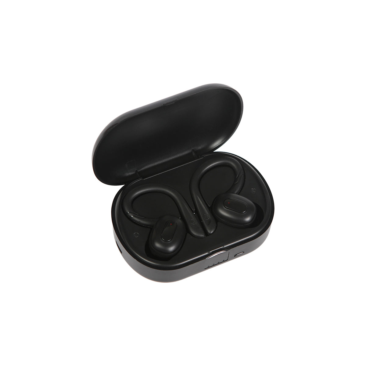 Audífonos con conexión de sonido sin cables, fabricados en plástico ABS con gancho anti caída de silicón y estuche de plástico. Incluye cable para carga USB y caja de cartón individual.