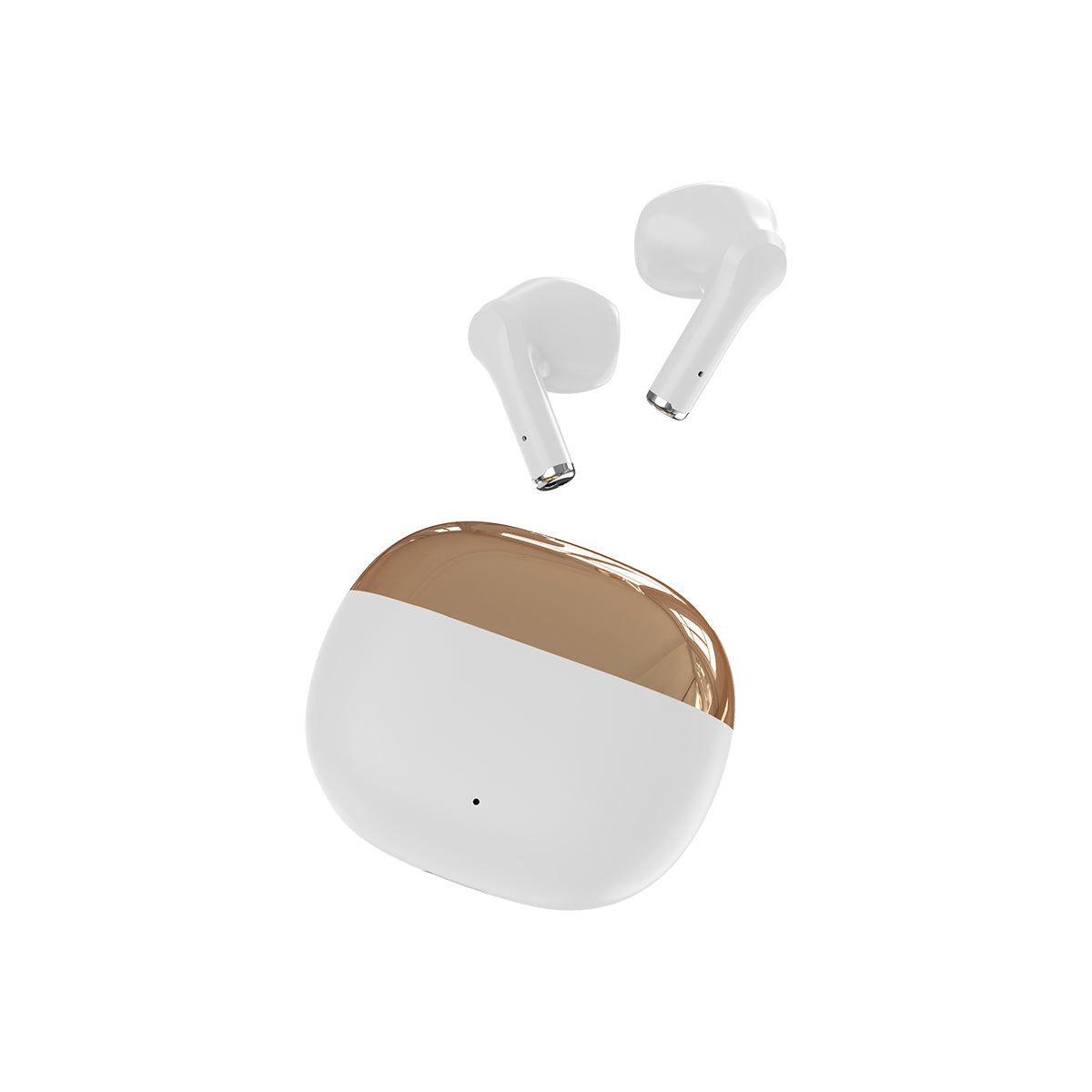 Audífonos con conexión de sonido sin cables bi-tono, en la parte superior con acabado brilloso, y parte inferior con acabado mate, con estuche de carga ovalado, los audífonos tienen un ligero detalle en color plateado en la parte inferior.  Incluye cable de carga USB y caja de cartón individual.