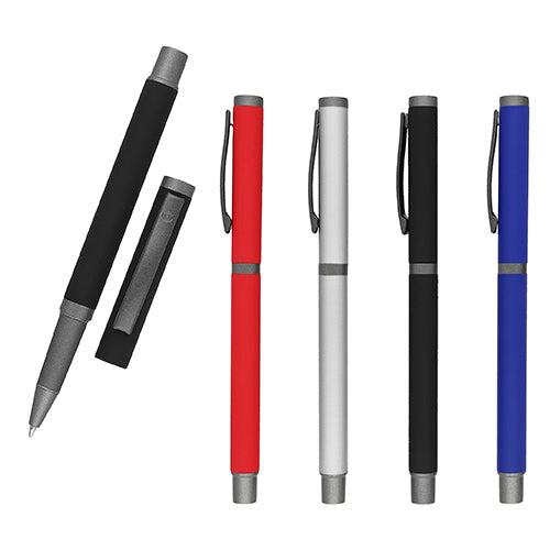 Bolígrafo metálico acabado rubber con detalles en base y tapa color gris.. Medida producto alto: 13.3 . Medida producto ancho: 1 . Area impresion: 0.7 x 4 cm