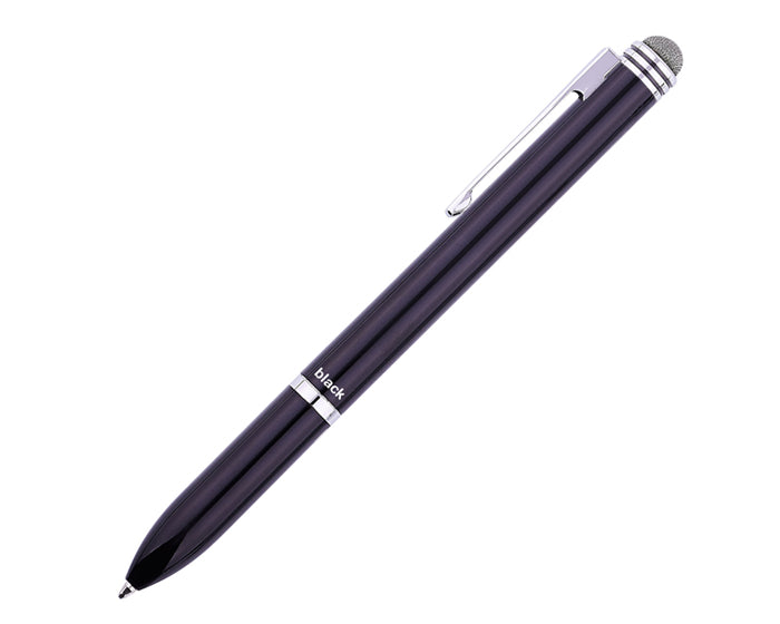 Bolígrafo metálico con acabado brillante y elegante diseño. Punta touch de malla metálica firmemente tejida para un rendimiento superior y preciso en dispositivos táctiles. Mecanismo twist, que al girar indica el color de tinta el cual puede ser azul o negro. Presentación: caja en color negro.