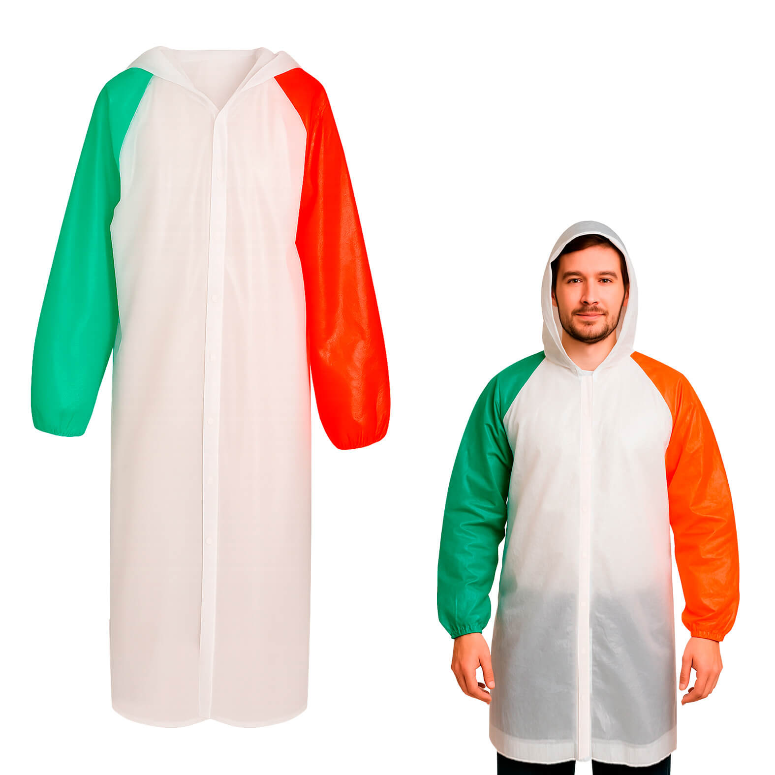 Impermeable tricolor con capucha botones y mangas con resorte.. Medida producto alto: 69 . Medida producto ancho: 120 . Area impresion: 13 x 10 cm