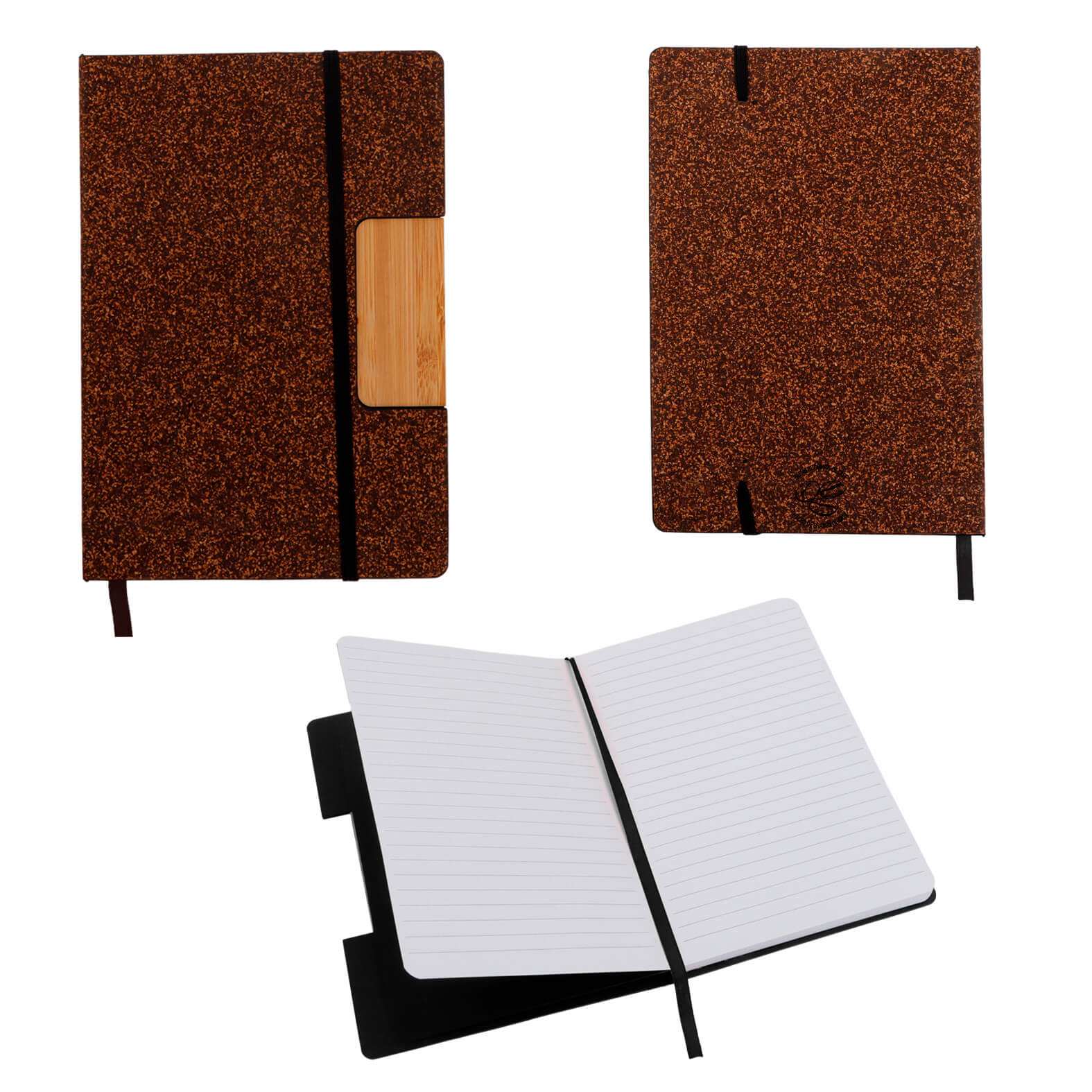 Libreta reciclada de café con 82 hojas de raya, detalle de bambú que sirve cómo soporte para celular, separador y banda elástica.. Medida producto alto: 21 . Medida producto ancho: 14.5 . Area impresion: 7 × 15 cm