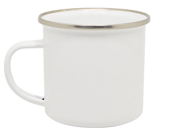 Taza de peltre para sublimar. Borde con terminado plateado. Cap. 350 ml.