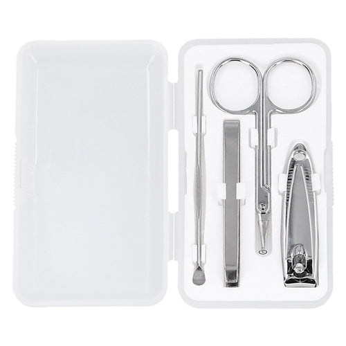 Set de manicure en estuche de plástico con 4 piezas: tijeras, cortaúñas, pinzas para depilar y empujador de cutícula.. Medida producto alto: 10 . Medida producto ancho: 5.5 . Area impresion: 3.5 x 4.5 cm