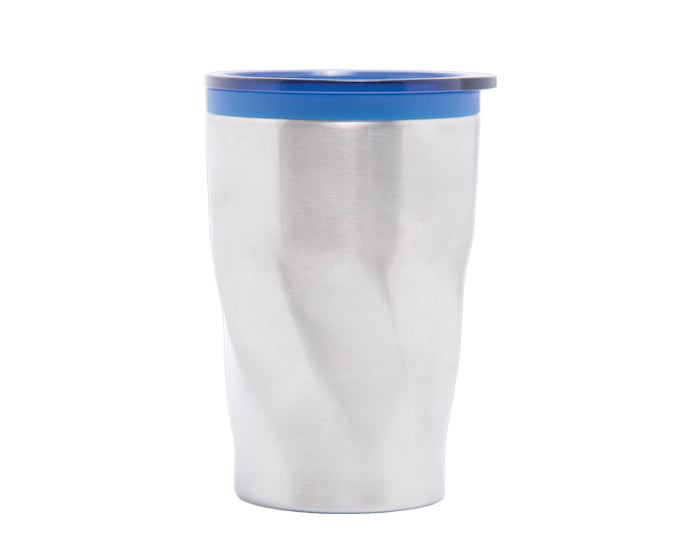 Termo de acero inoxidable con interior de plástico. Cuenta con tapa de cierre a presión y seguro deslizable al color del interior. Diseño poligonal de rombos. CAP. 350 ml.