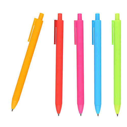 Bolígrafo con acabado rubber, tinta negra, clip de plástico y mecanismo de click.. Medida producto alto: 14 . Medida producto ancho: 1 . Area impresion: 0.8 x 4 cm