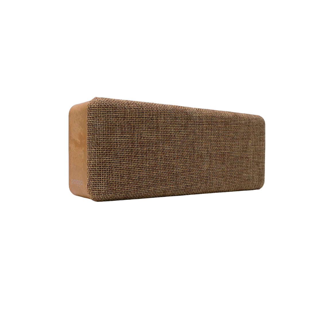 Bocina Bluetooth portátil con acabado en madera de origen biobasado.