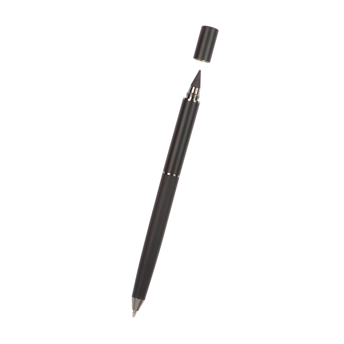 Bolígrafo dos en uno con barril fabricado en aluminio con acabados mate, tipo ball pen, tinta de escritura negra. Y del otro lado tiene la función de lápiz infinito. Incluye caja de regalo color negro.