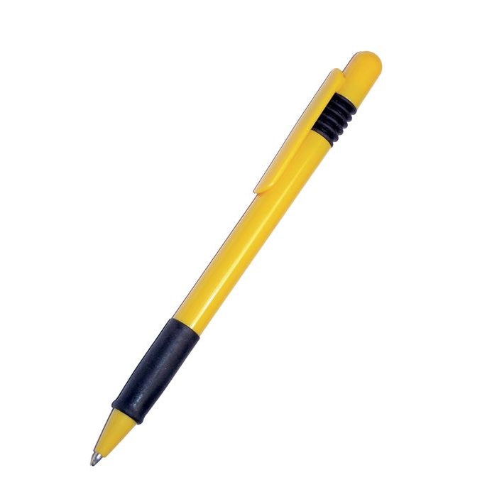 Bolígrafo fabricado de plástico de color sólido, con mecanismo retráctil, de punta fina con clip y agarre.