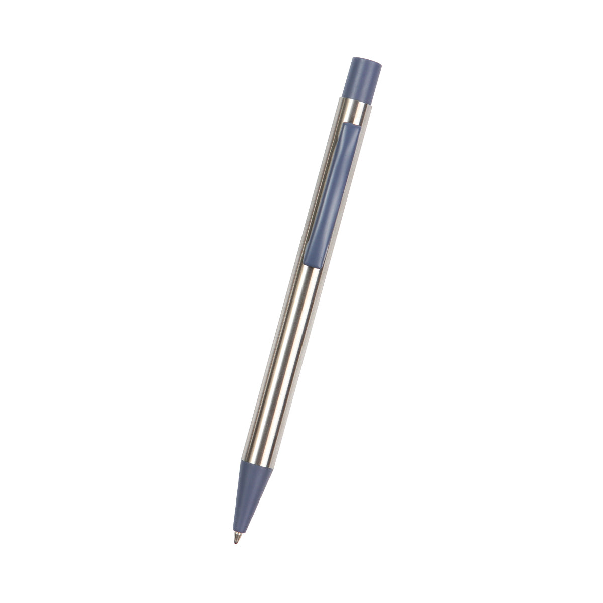 Bolígrafo con mecanismo de botón, barril fabricado de acero inoxidable reciclado, con clip metálico, tinta de escritura azul.