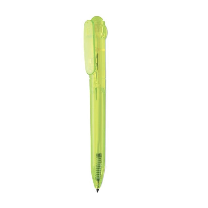 Bolígrafo fabricado de plástico traslúcido, de punta fina con clip y mecanismo retráctil. Disponible en colores: amarillo, azul, rojo y verde.