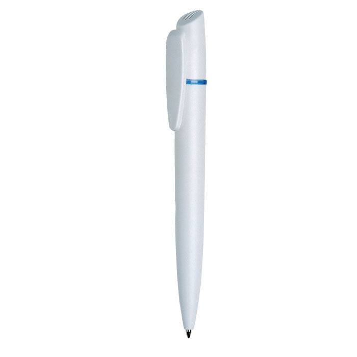 Bolígrafo fabricado de plástico blanco sólido con punta fina y mecanismo retráctil. Clip disponibles en colores: amarillo y verde.