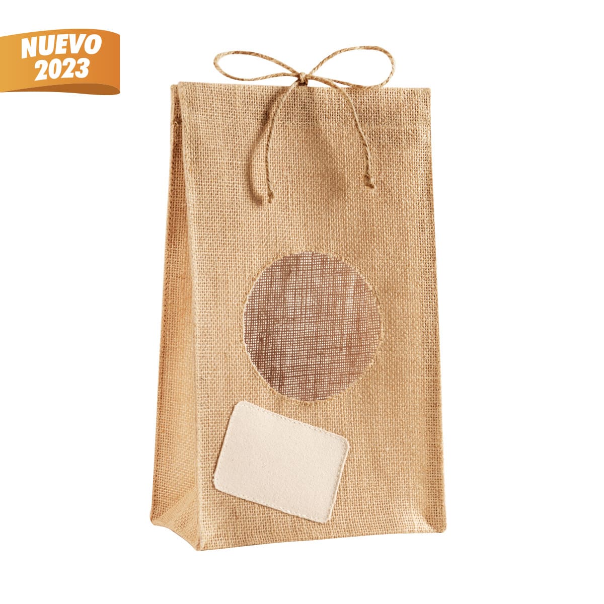 Bolsa de yute laminada. Cierre de cordón. Ventana de PCV y parche de algodón para impresión. El yute es un producto natural el cual puede presentar variaciones en tonalidades y en la urdimbre y trama de la tela.. Medidas: 18 x 30 x 10 cm . Material: Yute / PVC