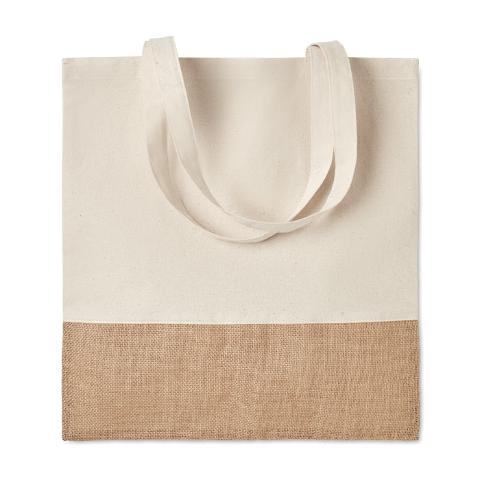 Bolsa de mano para compras fabricada de sarga de algodón con detalle de yute. Asas largas, 160 gr m². Producido según el estándar OEKO-TEX.