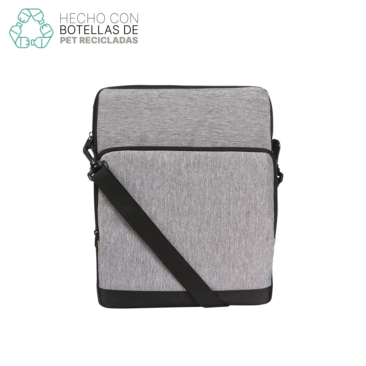 Bolsa multiusos fabricada en  poliéster reciclado RPET y polilona, lo que la hace ecoamigable, resistente y capaz de soportar el uso diario.  Adicional a su amplio compartimento  principal cuenta con un bolsillo frontal espacioso y bolsillos traseros de malla, perfectos para guardar objetos de uso frecuente o de fácil acceso.  Adicionalmente cuenta con una correa ajustable que puede retirarse y te permite llevarla cómodamente al hombro o cruzada en el cuerpo. El RPET es un material resistente y duradero que puede soportar el uso diario y el desgaste, lo que lo hace ideal para productos textiles. Además es sostenible porque utilizan materiales reciclados en su fabricación, lo que reduce la cantidad de residuos y disminuye el impacto ambiental.