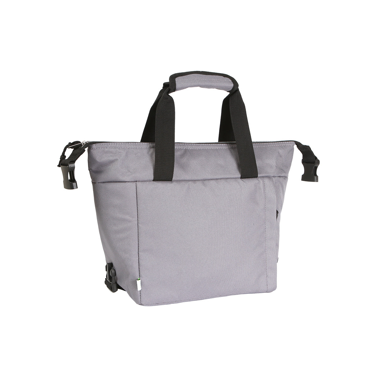 Bolsa para alimentos fabricada en poliéster, con relleno de espuma PE y revestimiento de papel aluminio. Incluye asas, compartimento principal y bolsillo secundario.