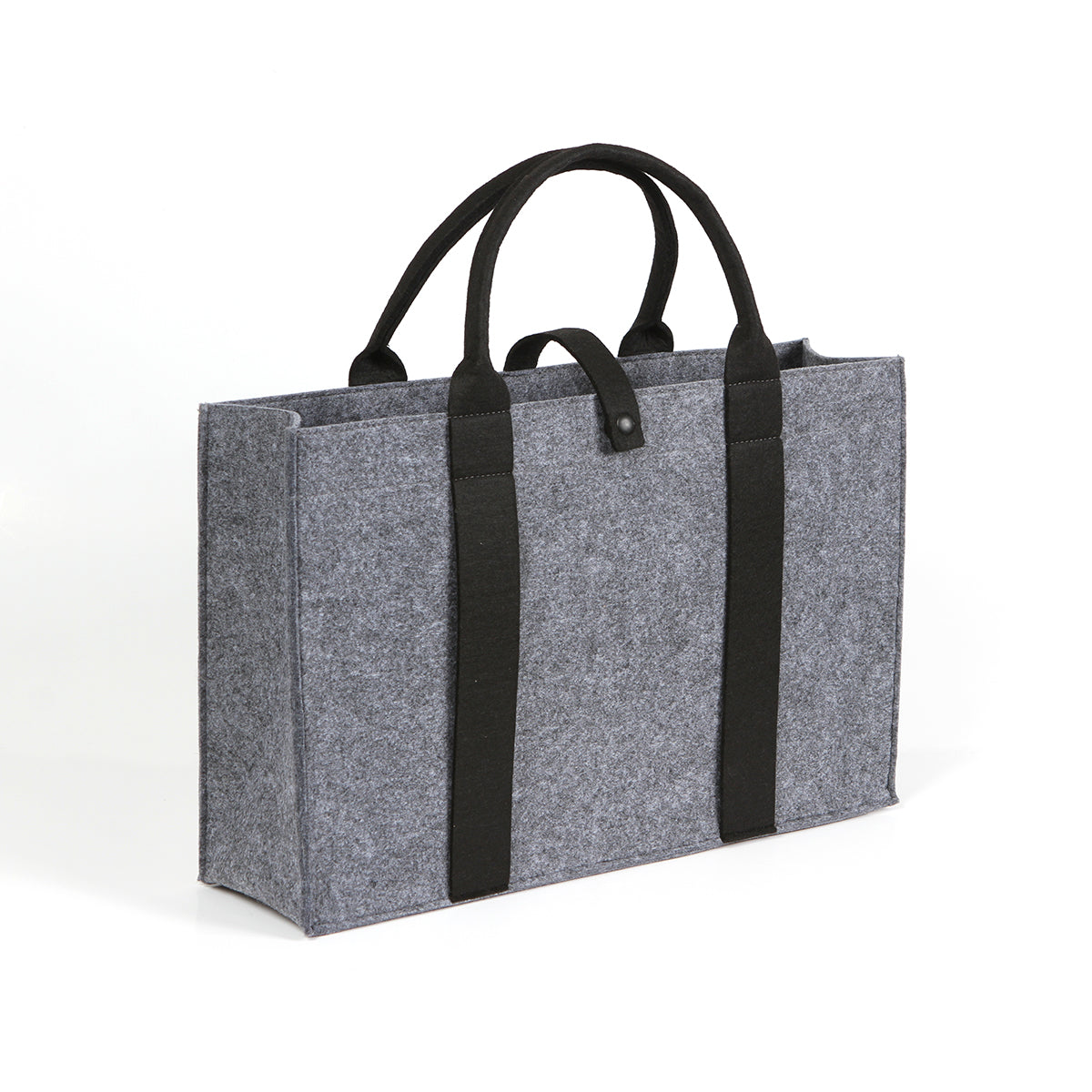 Bolsa fabricada en fieltro, con doble asa, fuelle y broche para cerrar. Detalles a contraste en color negro. Esta bolsa es un accesorio esencial que combina estilo, durabilidad y funcionalidad.