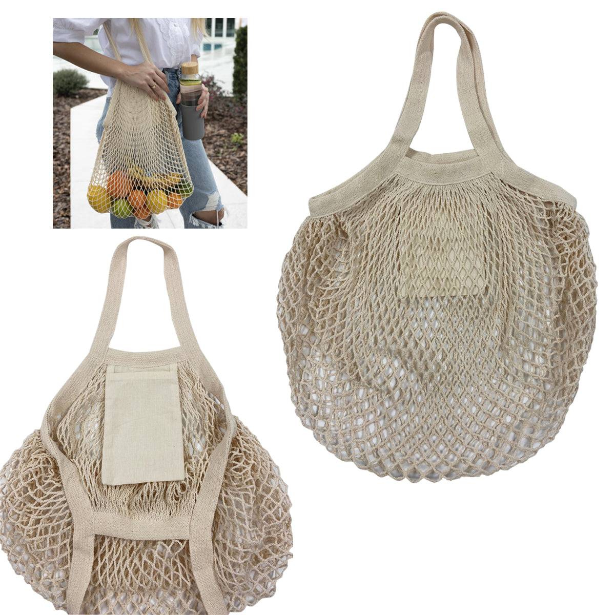 Bolsa para alimentos fabricada de la combinación de: 8 Oz. de lona de algodón y malla de algodón. Cuenta con un bolsillo interior con cierre y asas de 22 ½.