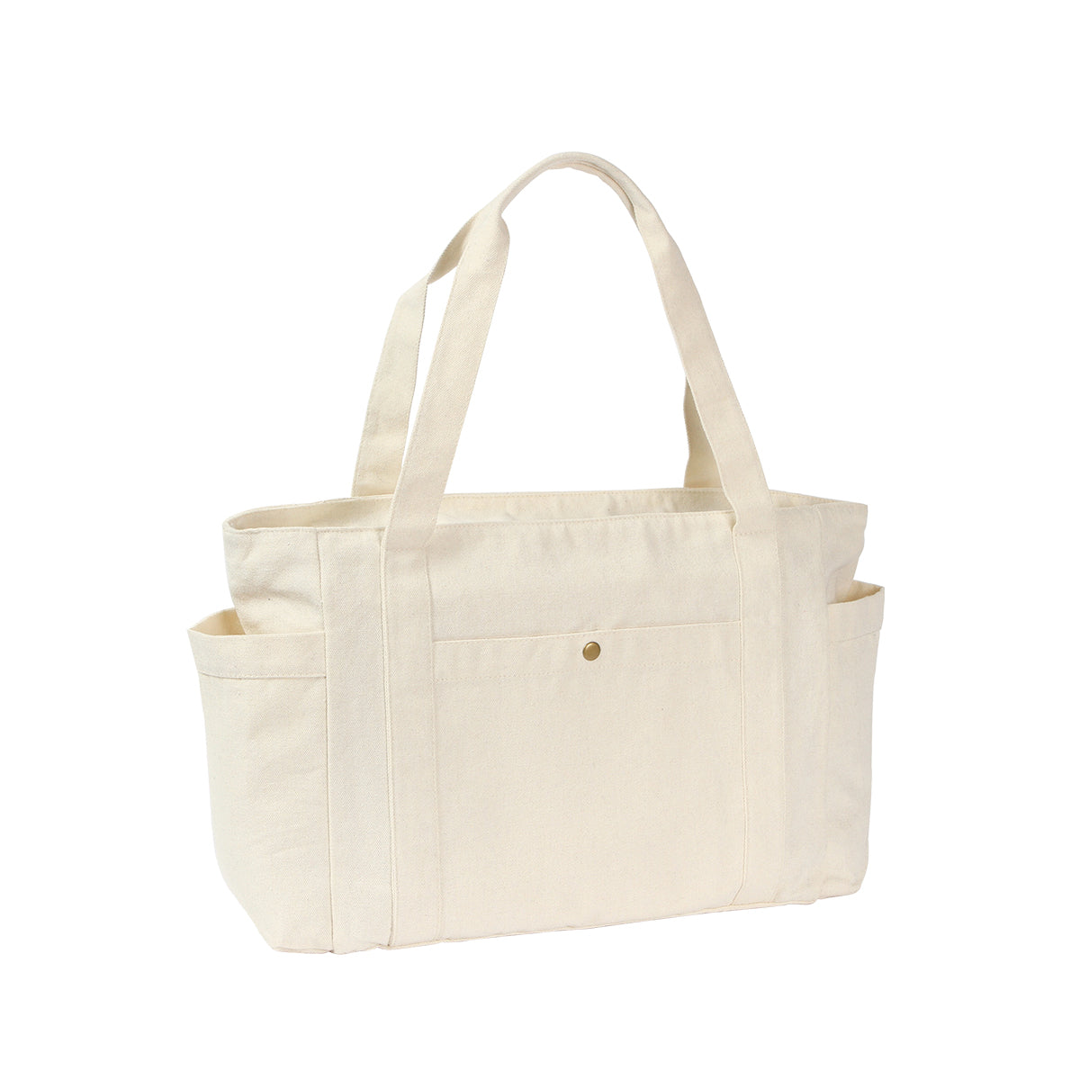 Bolsa tote de mano fabricada en poliéster y algodón tipo canvas. Diseño cuadrado con un compartimento principal, una bolsa frontal pequeña con broche a presión y doble asa. Tamaño ideal para llevar articulos escolares o de belleza