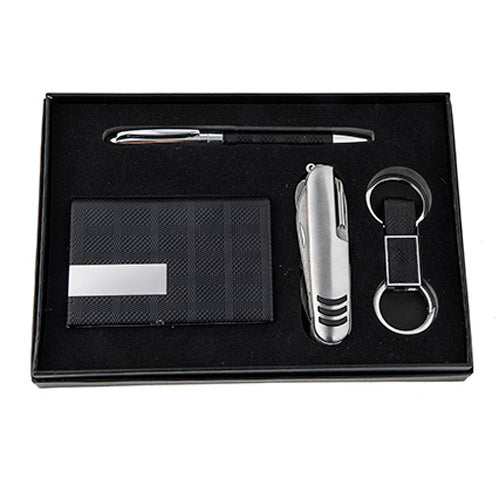 Set ejecutivo Incluye: llavero metálico, porta tarjetero, bolígrafo, navaja y estuche de regalo.. Medida producto alto: 14 . Medida producto ancho: 20 . Area impresion: 15 x 7 cm