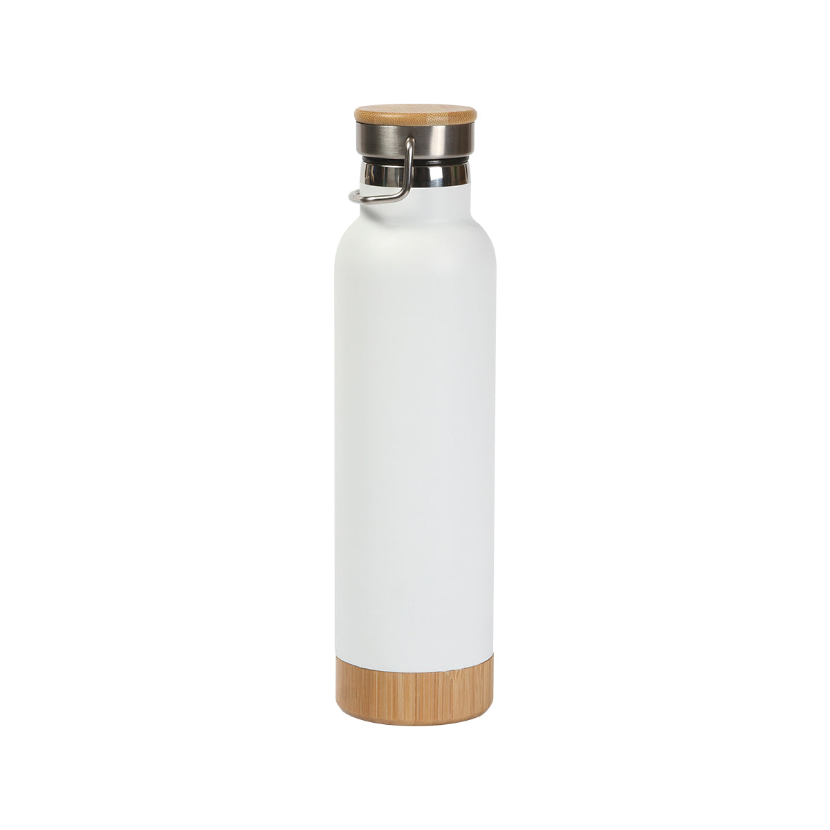 Botella con asa fabricada en  acero inoxidable reciclado doble pared con tapa de rosca fabricada en bambú, detalles en la base del mismo material. Capacidad de 600 ml,  es una opción sostenible y elegante para mantener tus bebidas frías o calientes mientras contribuyes al cuidado del medio ambiente, incluye caja individual