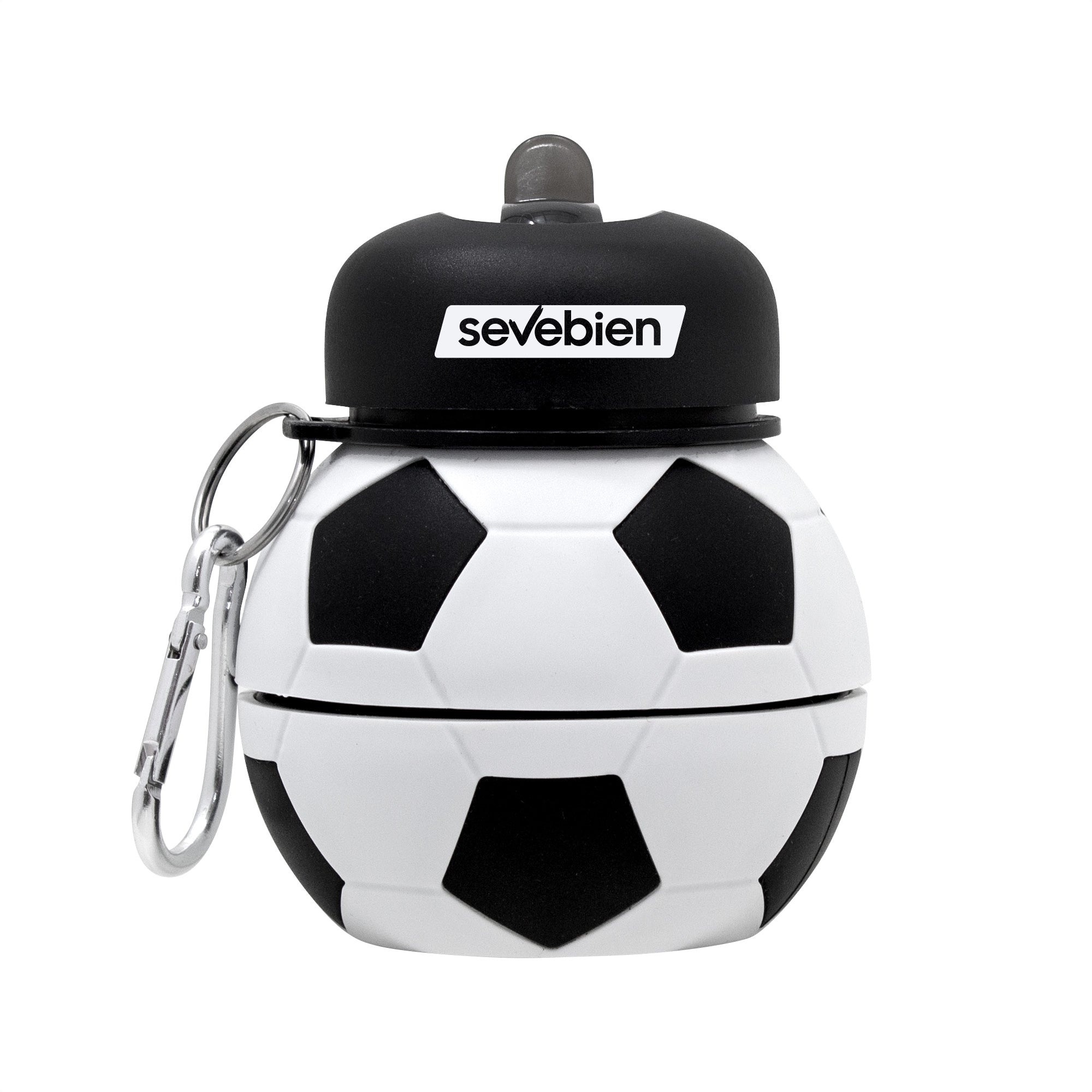 Cuando empieza el partido se despliega la hidratación. Botella plegable con forma de pelota de fútbol. Al desplegarse se descubre la imagen de un campo de juego. Tapa plástica con boquilla y seguro antivuelco. Mosquetón de aluminio plateado. Para ajustar el tamaño de la botella, simplemente despliega la boquilla y ajusta la altura según tus necesidades.Medidas: Ø 9 x 11 cm. y 19 cm. desplegada Capacidad: 500 ml. desplegada.  Materiales: Silicona, polipropileno y poliestireno.  Presentación: en caja de regalo Kraft.