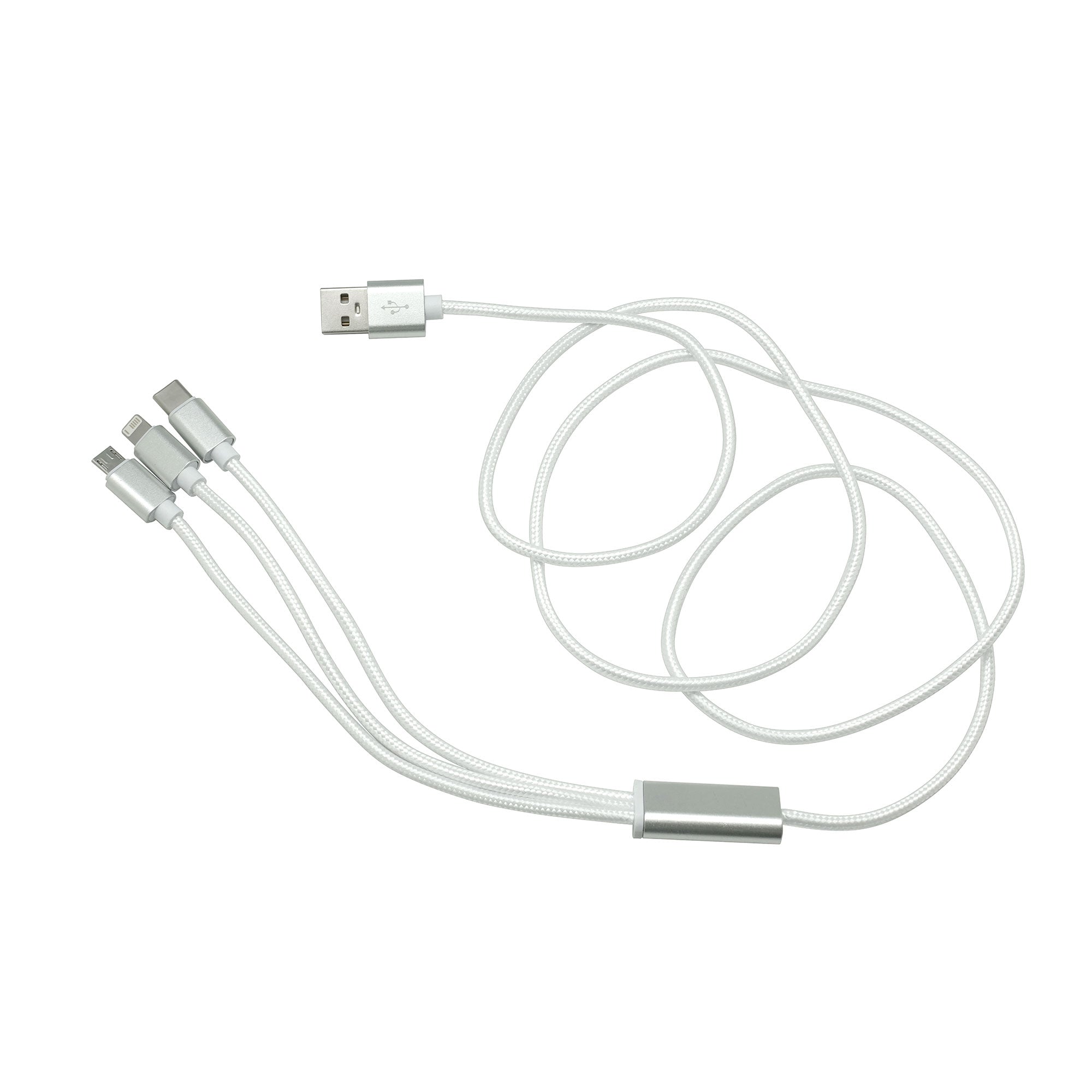 120 cm. Aluminio y Nylon. Cable con entrada USB y diferentes adaptadores: Iphone, tipo C y Android. Viene dentro de una bolsa plásticas con cierre ziploc.. Medidas Ancho: 29.0 . Medidas Alto: 36.0 . Medidas Profundidad: 30.0