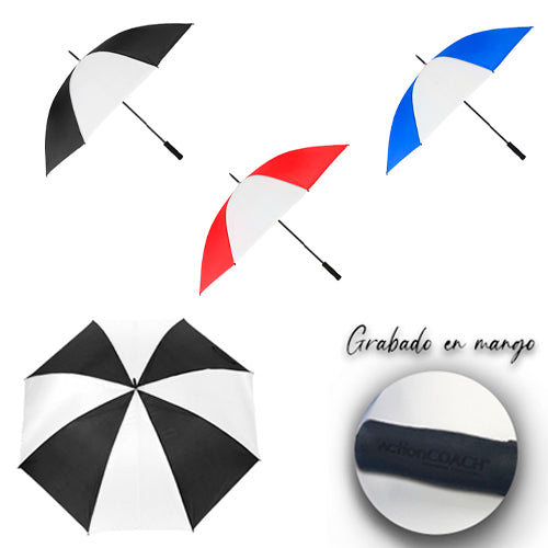 Paraguas bicolor con sistema manual, 8 gajos y mango de eva.. Medida producto alto: 100 . Medida producto ancho: 129 . Area impresion: 23 x 20 cm