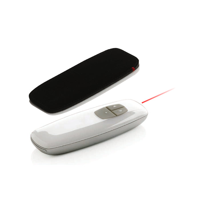 Cambiador de diapositivas con apuntador láser fabricado en plástico de color blanco con tres botones en la parte frontal de color gris. Compatible con MAC y PC. Empacado individualmente en caja XDDESIGN®