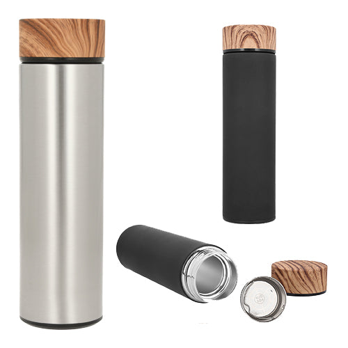 Termo de acero inoxidable con doble pared, acabado rubber, tapa con simulación de madera e infusor.. Medida producto alto: 23 . Medida producto ancho: 6.5 . Area impresion: 5 x 6 cm