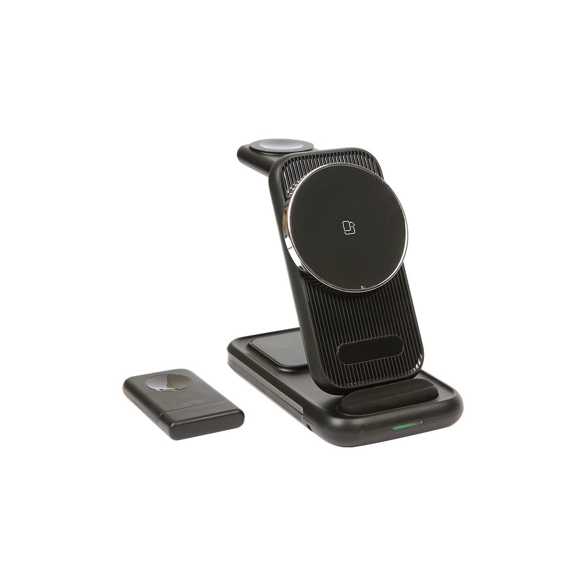 Cargador inalámbrico 4 en 1. apto para cargar teléfono, reloj y audífonos inalámbricos. Capacidades de carga 5W7,5W10W15W MAX. Cuenta con salida USB tipo-C. Diseño plegable. Cuenta con protección contra sobrecarga y colocación de objetos extraños.