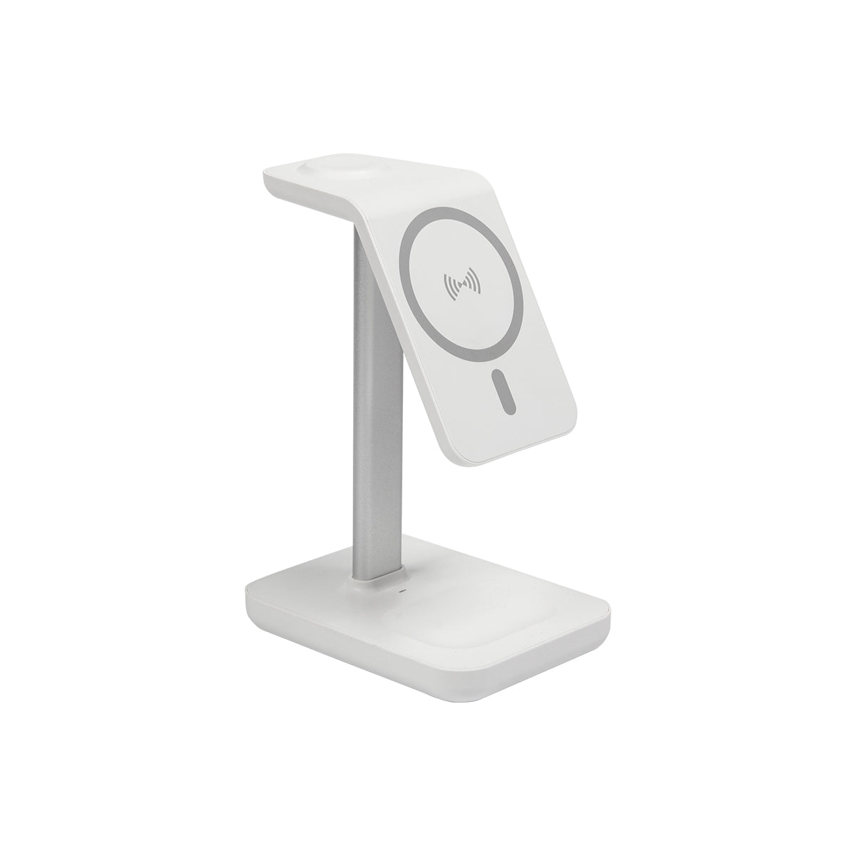 Cargador inalámbrico 3 en 1  fabricado en plástico ABS y metal, carga a través de cable USB incluido. Apto para dispositivos con tecnología Qi. Cuenta con varios espacios de carga lo que te permite cargar tu celular, audífonos y reloj al mismo tiempo. Su diseño compacto y elegante es ideal para cualquier espacio.Incluye caja de cartón individual