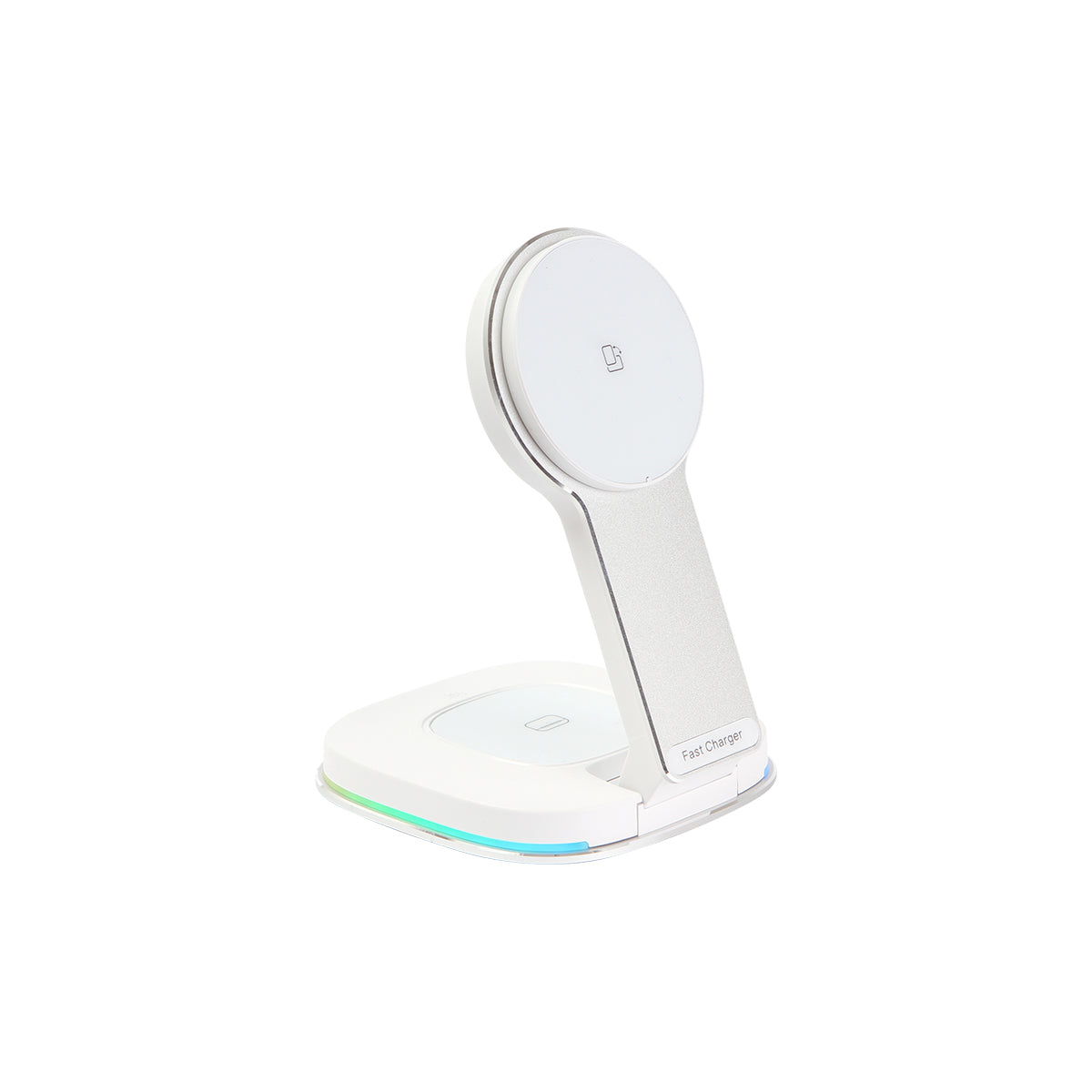 Cargador inalámbrico multifunción reloj, audífonos y celular, fabricado en ABS, Policarbonato PC, silicón y aleación de aluminio. Potencia de carga de hasta 15 W.  Diseño plegable.
