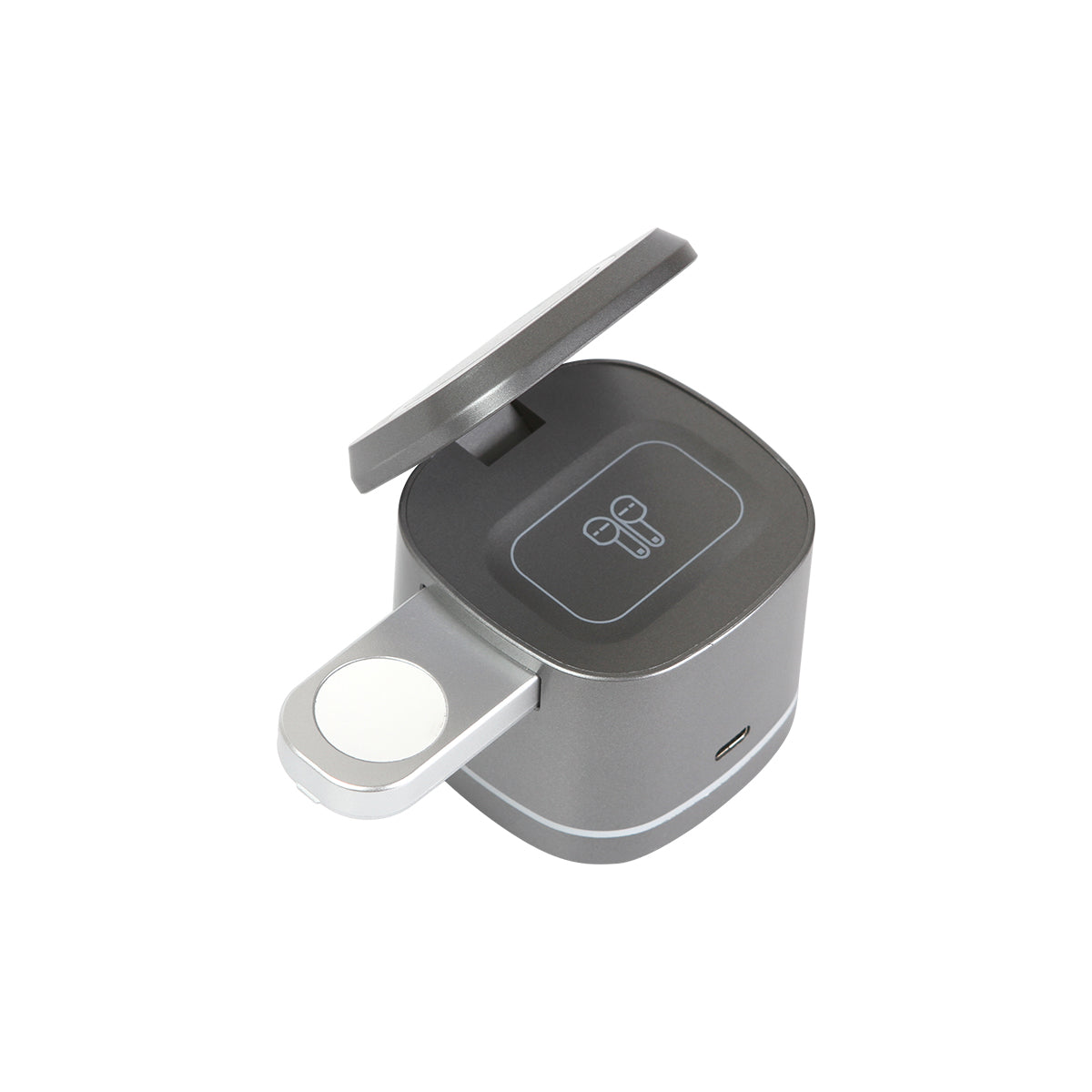 Cargador inalámbrico fabricado en ABS y plástico de policarbonato PC, compatible con celular, reloj, y audífonos. Potencia de carga de 5w7,5w10w15w para celular, 2,5w para reloj inteligente y 3w para audífonos inalámbricos.