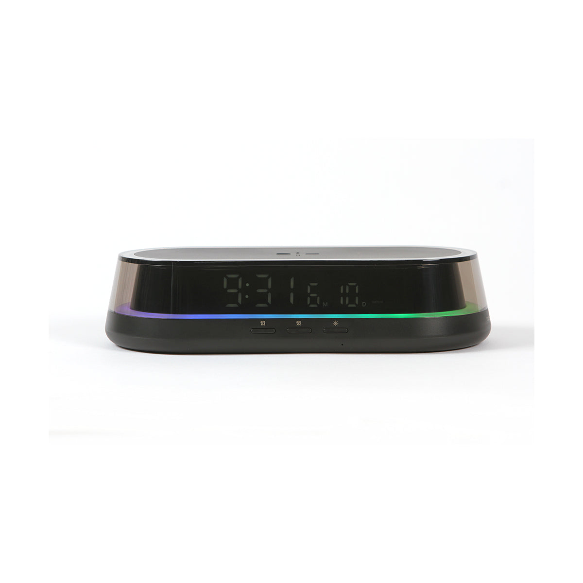 Cargador inalámbrico multifuncional para teléfono celular 15W. Con reloj y función de alarmas, incluye una lámpara de luz blanca en tres niveles y luz tipo RGB colores. Diseño ergonómico especializado para escritorio yo buró.