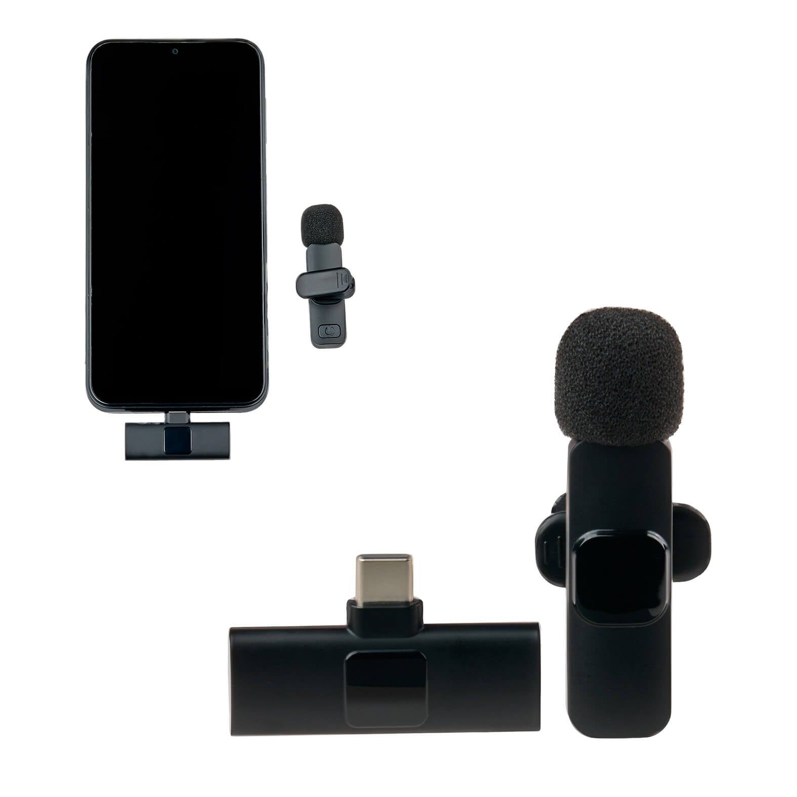 Micrófono inalámbrico con pinza y conexión lightning, botón de encendidoapagado, carga Tipo C y conexión Bluetooth. Incluye adaptador tipo C. Medida producto alto: 1.5 . Medida producto ancho: 4.4 . Area impresion: 1 x 1.3 cm