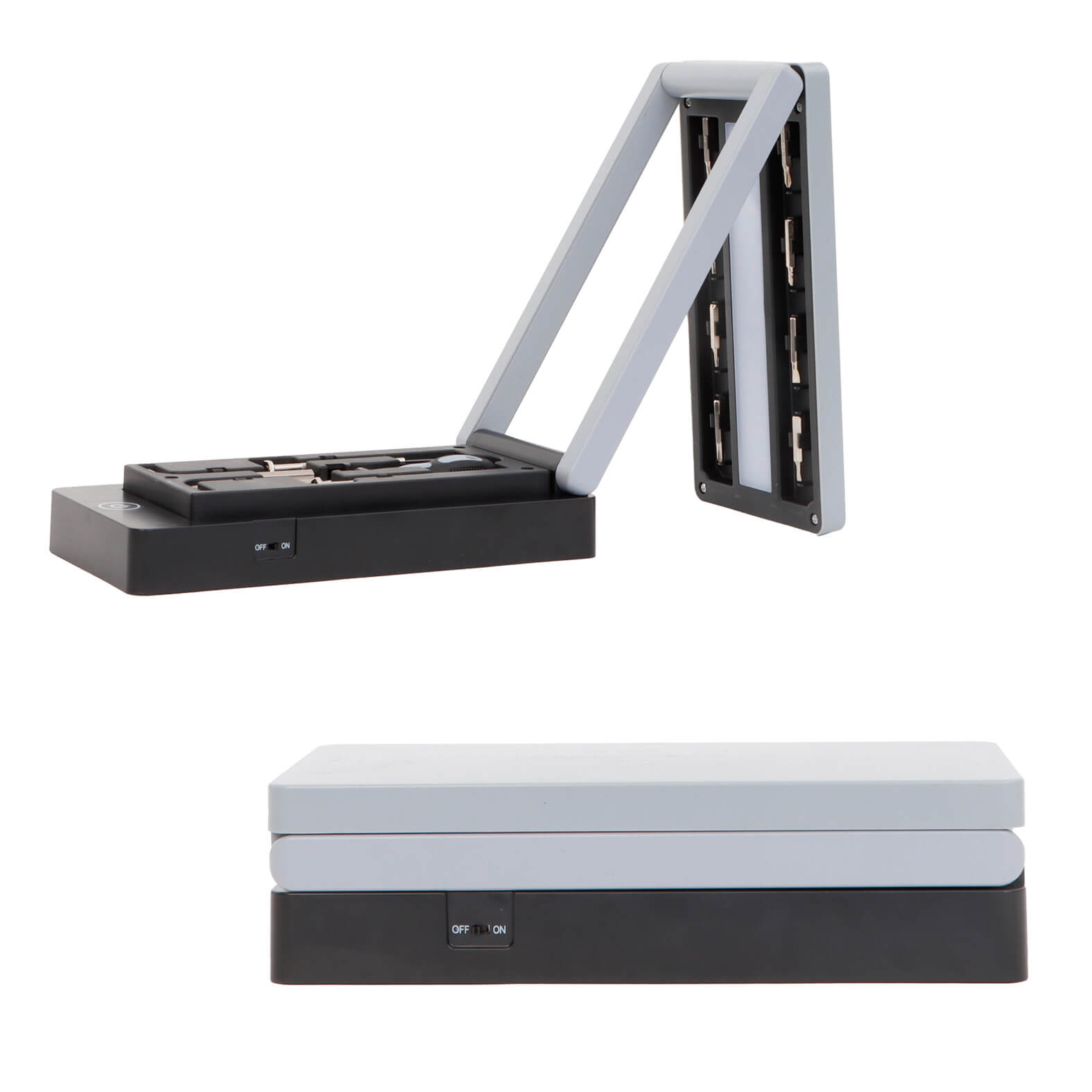 Set de herramientas en estuche de plástico con lámpara LED flexible de mecanismo touch y 3 niveles de luz que funciona con 3 baterías AA. Contiene: 1 desarmador con 8 puntas intercambiables, 2 desarmadores de precisión y 2 llaves Allen.. Medida producto alto: 9.5 . Medida producto ancho: 19.8 . Area impresion: 12 x 6 cm