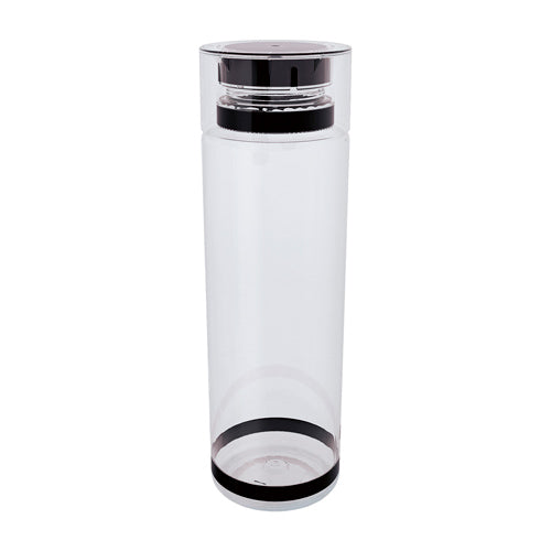 Sistema de rosca twist-off que permite abrir y cerrar la tapa en un giro. Cuenta con dos bandas elásticas de silicón, una en el cuello y otra en la base del cilindro. Mantener el linner en el interior de la tapa en todo momento, se debe retirar hasta su uso final. No exponer el cilindro a temperaturas mayores a 40 °C y revisar que la tapa no esté cerrada completamente para su almacenamiento y transportación. No apto para bebidas calientes. No introducir en microondas ni lavavajillas.. Medidas: 7.4 x 24.5 cm . Material: PET / Silicón