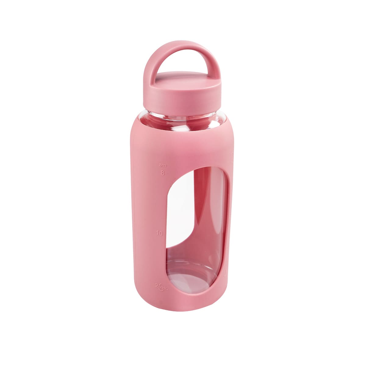 Cilindro de vidrio con manga de silicón graduada en ml. Tapa de plástico con sistema de rosca y asa. Vidrio resistente a bebidas calientes y frías. Incluye caja individual.. Medidas: 8.8 x 23 cm . Material: Vidrio Borosilicato / Silicón / Plástico