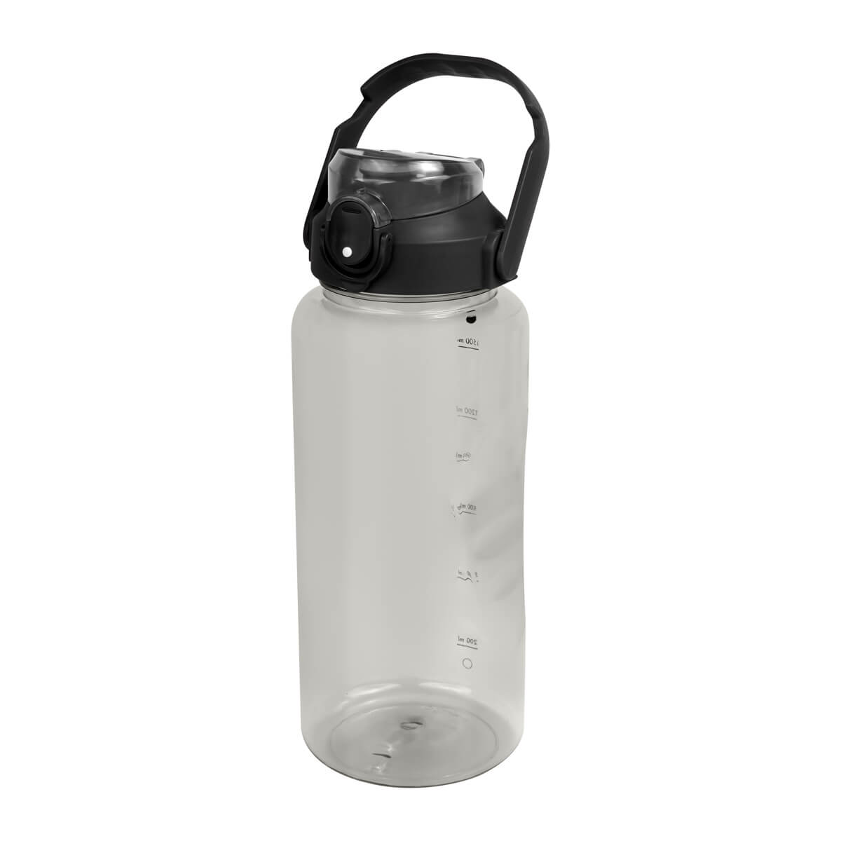 Tapa de plástico con cierre de rosca y boquilla, sobretapa push con botón de seguridad y asa plegable con phone holder para colocar el celular. Cuerpo traslúcido, resaques laterales para un mejor agarre, indicador de mililitros para motivar y controlar tus hábitos de hidratación. Incluye caja individual.. Medidas: 10.4 x 29 cm . Material: Plástico